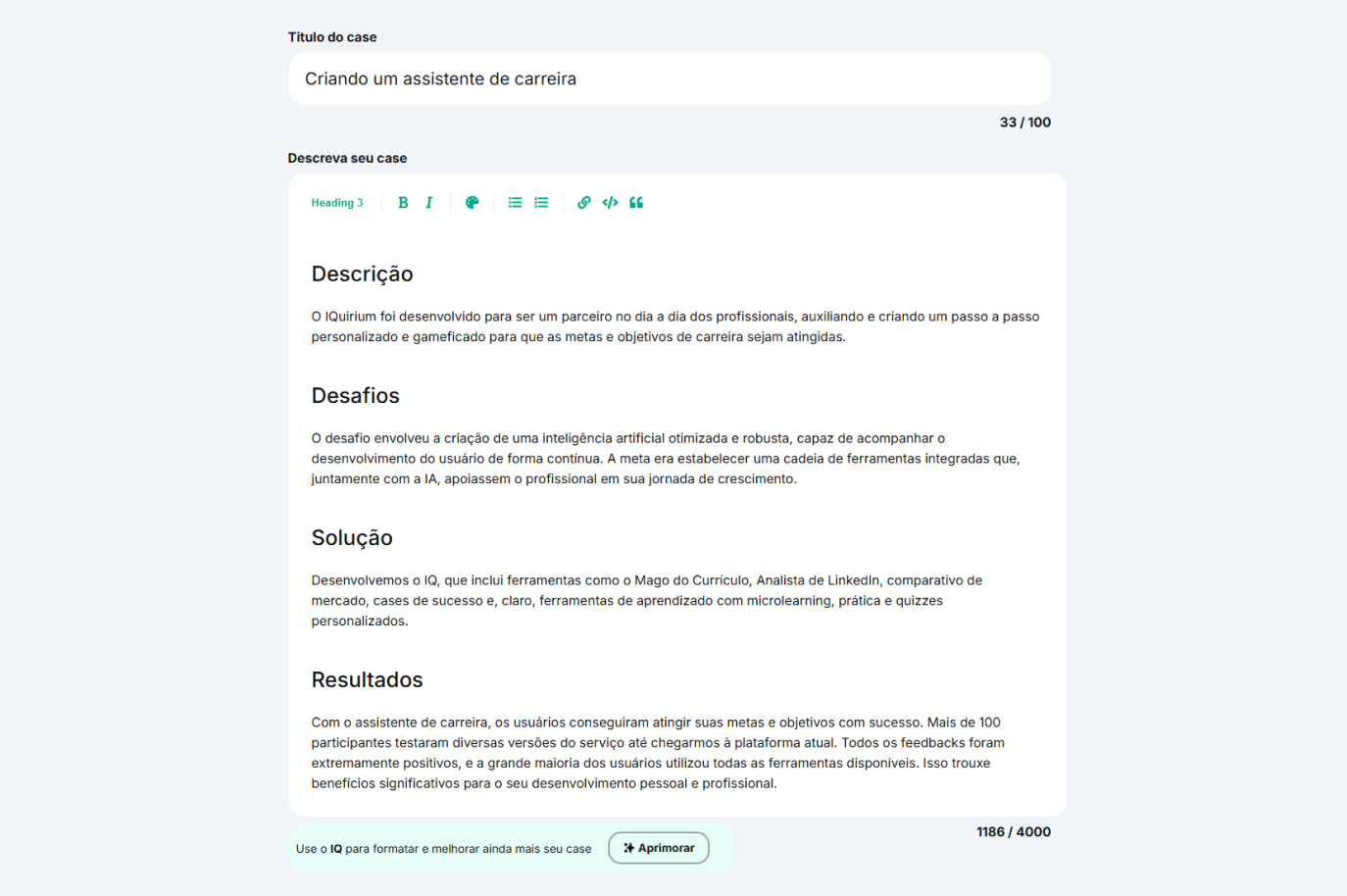 Mas lembre-se: o IQ já segue uma metodologia estruturada para criação de cases, use o conteúdo customizado apenas se quiser detalhar ainda mais ou adotar uma nova abordagem.