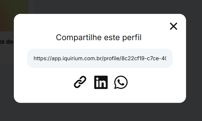 E atalhos rápidos para compartilhar diretamente no LinkedIn ou WhatsApp, levando o link do seu portfólio com apenas um toque.