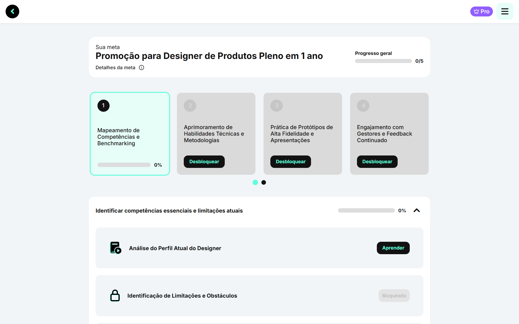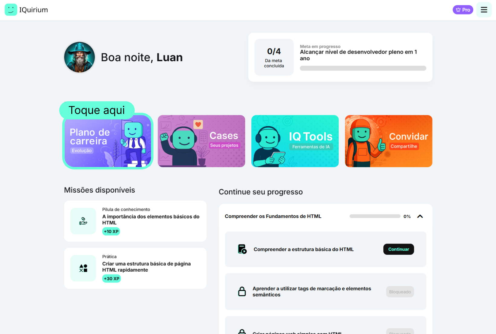 Com ele, você define uma meta de carreira e o IQ que é nossa inteligência artificial te ajuda a quebrar essa meta em etapas práticas, mensuráveis e motivadoras, guiando você até a conquista.