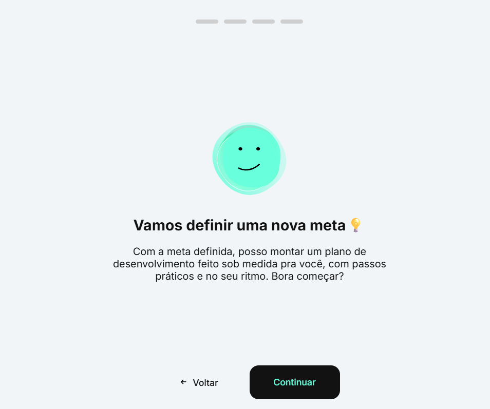Caso você não saiba ou tenha uma meta clara, não tem problema, o toque no botão de "Não tenho uma meta clara" e o IQ vai te fazer perguntas especificas para te ajudar a definir uma meta com mais clareza.