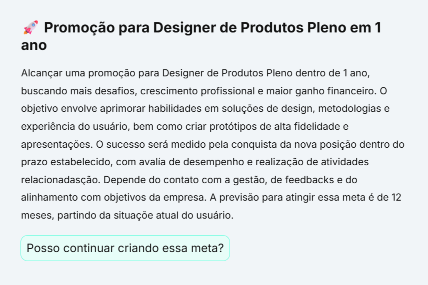 Após responder tudo, o IQ gera um resumo detalhado da sua meta — incluindo contexto, prazo, foco de desenvolvimento e impacto esperado.