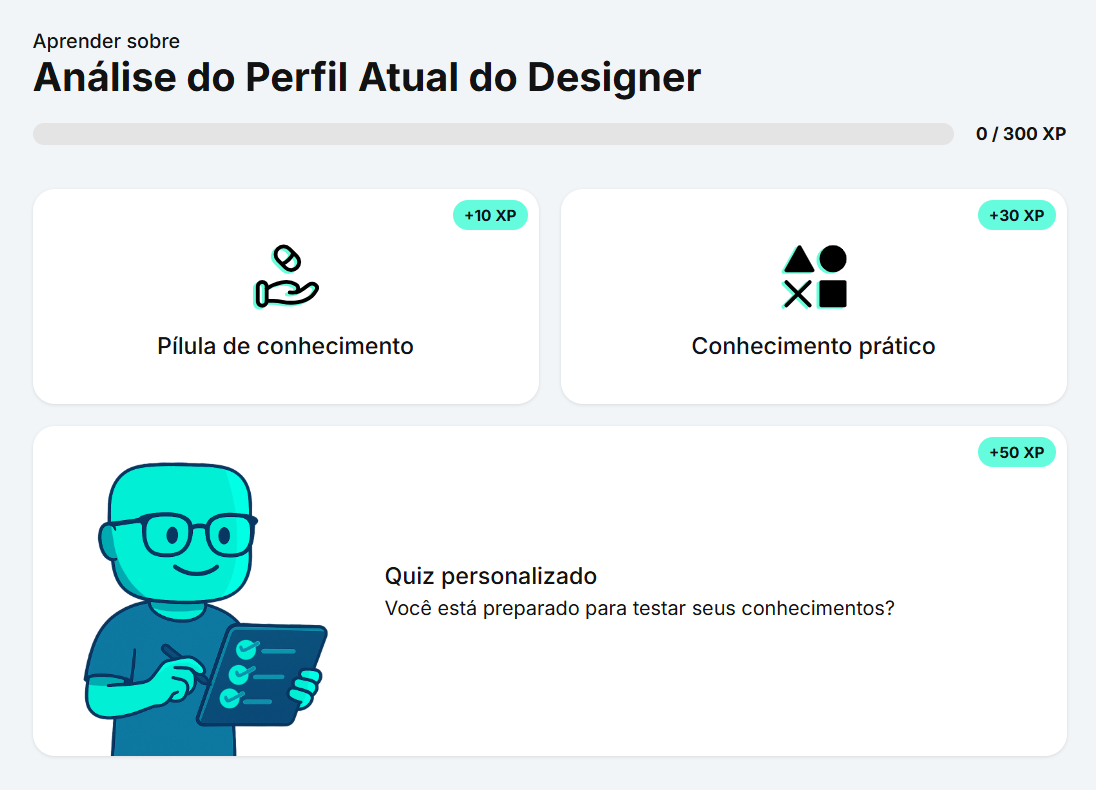 Cada missão contém microlearnings, pequenas experiências de aprendizado que acumulam XP (pontos de experiência) conforme você avança.